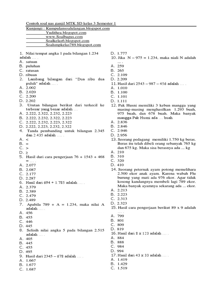 Ujian Akhir Semester (UAS) adalah salah satu momen penting bagi siswa untuk menunjukkan pemahaman mereka terhadap materi yang telah dipelajari selama setengah tahun ajaran. Khususnya untuk mata pelajaran Matematika di Kelas 3 SD, UAS Semester 1 menguji berbagai konsep dasar yang menjadi fondasi bagi pembelajaran matematika di jenjang berikutnya. Bagi orang tua, membantu anak mempersiapkan diri adalah kunci. Bagi siswa, memahami materi dan berlatih soal akan menumbuhkan rasa percaya diri.